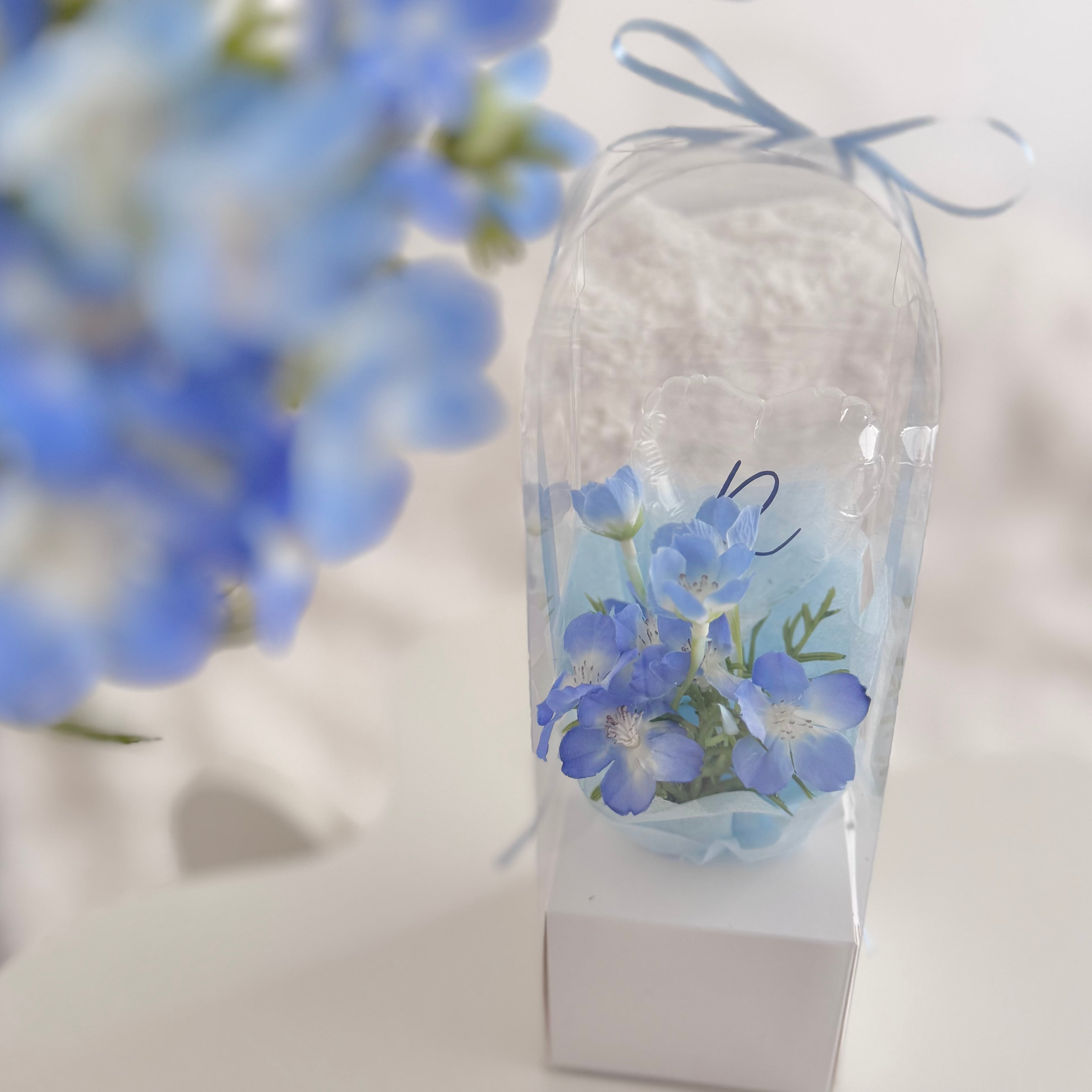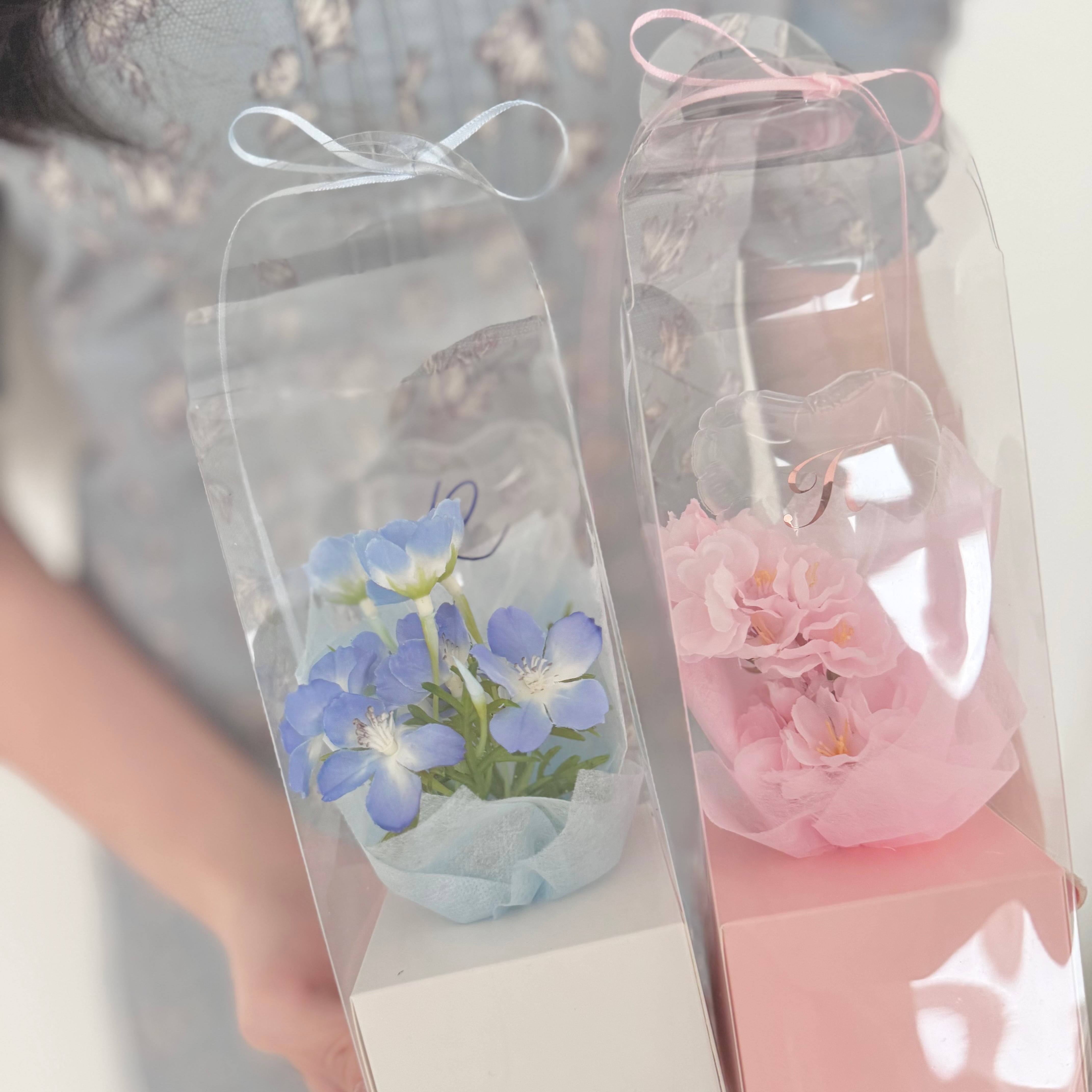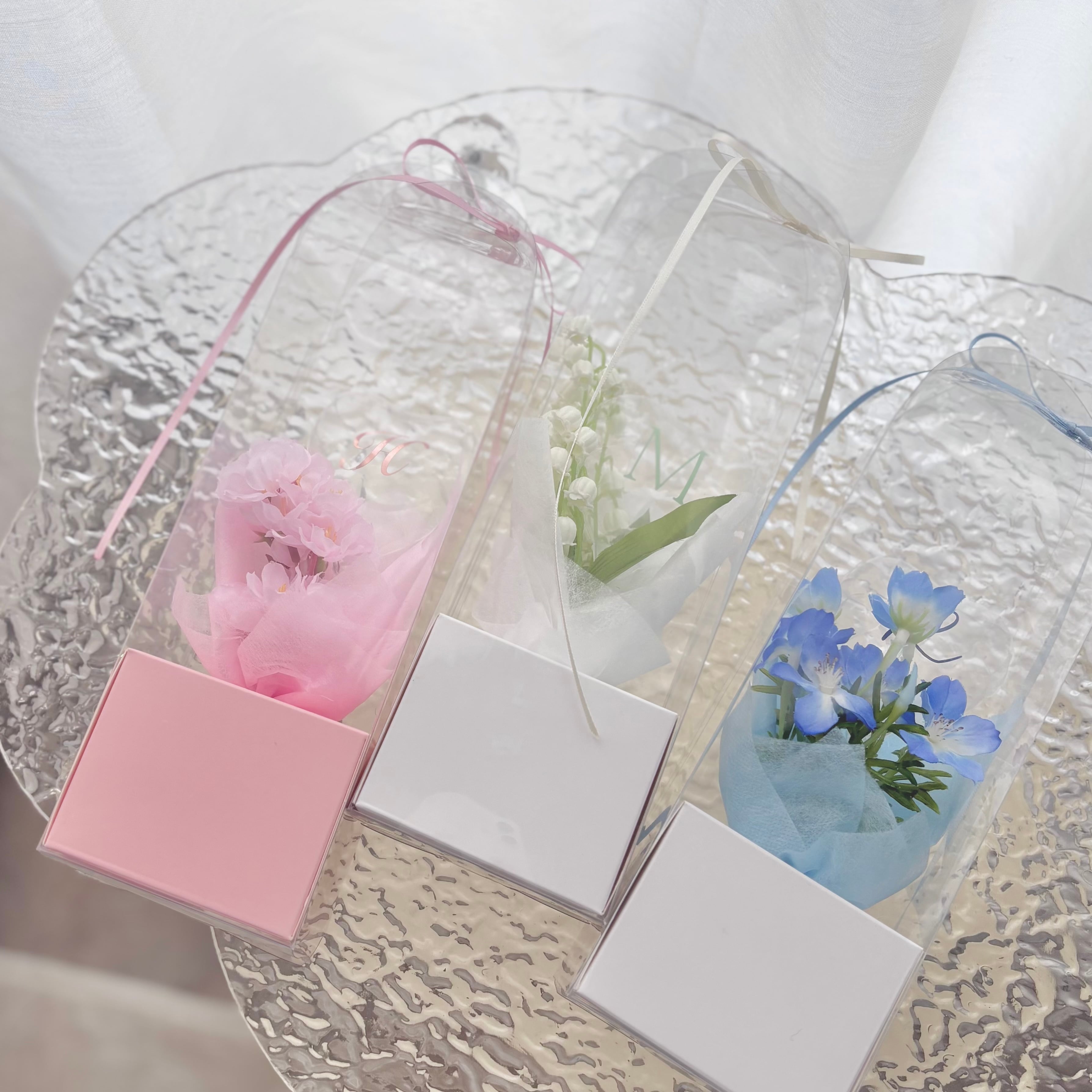 小さな箱の中にお花畑が詰まったような、新しいクリアブーケ。